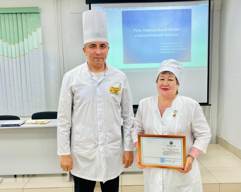 В начале совещания главный врач Бакалинской ЦРБ Забир Саримович Гиздатуллин вручил нагрудный знак "Отличник здравоохранения РБ" медицинской сестре Зариповой Афлюде Кандельгилемовне.