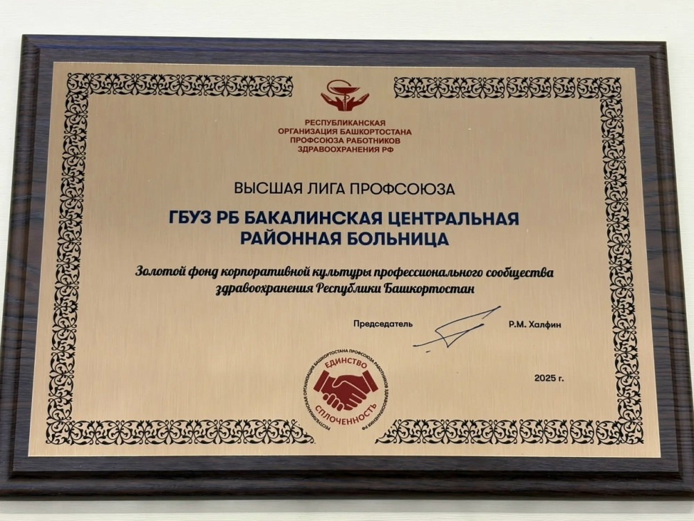 На данном мероприятии были награждены лучшие социальные партнёры дипломом "Высшая лига профсоюза. Золотой фонд профессионального сообщества здравоохранения Республики Башкортостан". Эта почетная награда Республиканского профсоюза работников здравоохранения, вручаемая медицинским организациям за выдающиеся достижения в социальном партнёрстве и корпоративной культуре. В ходе торжественной церемонии министр здравоохранения РБ Рахматуллин Айрат Разифович и председатель РОБ ПРЗ РФ Халфин Рауль Магруфович вручили диплом главному врачу Бакалинской ЦРБ Гиздатуллину Забир Саримовичу.