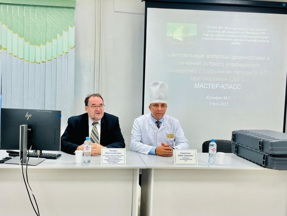 Сегодня, 19 декабря, в конференц-зале Бакалинской больницы прошла Республиканская научно-практическая конференция «Актуальные вопросы организации и оказания скорой и неотложной медицинской помощи» для врачей и фельдшеров скорой медицинской помощи, анестезиологов-реаниматологов, кардиологов, участковых терапевтов, фельдшеров ФАП, ответственных за оказание экстренной и неотложной помощи с целью расширения взаимодействия в сфере науки, образования, внедрения инновационных подходов в образовательной и научной деятельности, повышения уровня подготовки специалистов практического здравоохранения, а также в целях обеспечения доступности и повышения эффективности оказания скорой и неотложной медицинской помощи пациентам на догоспитальном этапе в Бакалинском районе. С приветственным словом выступил главный врач Гиздатуллин Забир Саримович.Заведующий кафедрой скорой помощи и медицины катастроф, термической травмы и трансфузиологии Башкирского государственного университета профессор Кунафин Марат Саубанович рассказал об актуальных вопросах диагностики и лечения острого коронарного синдрома с подъемом сегмента ST на догоспитальном этапе, об оказании скорой медицинской помощи при ОКС с подъемом сегмента ST в Бакалинском районе РБ. Также, провел мастер-классы «Эффективность сердечно-легочной реанимации. Нерешенные вопросы» и «Современные технологии наложения коникостомы».